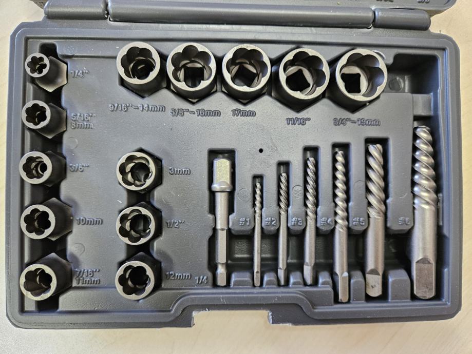 Izvlakač vijaka i matica 1/4" (6,3 mm), 5/16" (8 mm), 3/8" (9,5 mm), 7/16" (11 mm), 12 mm, 1/2" (12,7 mm), 13 mm, 9/16" (14 mm), 5/8" (16 mm), 17 mm, 11/16" (17,5 mm), 3/4" (19 mm)