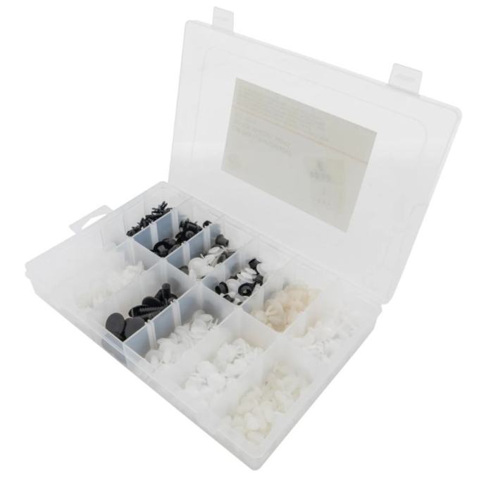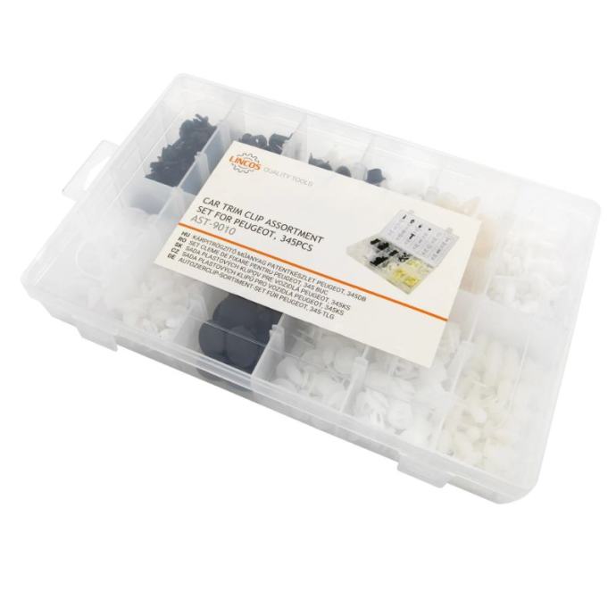 set kopči od 345 komada kompatibilan s vozilima Peugeot i Citroën uključuje 12 različitih vrsta kopči za pričvršćivanje letvica, ploča, branika i unutarnjih oblogaOve kopče su prikladne za različite Peugeot i Citroën modele, uključujući popularna vozila kao što su:Peugeot 206, 207, 307, 308, 406, 407, 508, PartnerCitroën C2, C3, C4, C5, Berlingo, Xsara Picasso Tehnički podaci:Vrsta isječka Količina OEM referencaTipska kopča (odgovara rupi od 5 mm)50 komOE31617Stezaljka za oblogu vrata20 komOE31661Spojnica za kalupljenje20 komOE31669Stezaljka za obloge vrata20 komOE36161Udarna traka odbojnika ukrasne ploče25 komOE36162Stezaljka za letvu obloge branika35 komOE36163Cjevasta matica / bačvasta matica30 komOE31688Stezaljka za oblogu vrata35 komOE31690Držač na pritisak15 komOE31693Držač obrubne ploče25 komOE36164Obloga i kopča za rešetku30 komOE36165Obloga za Peugeot40 komOE36166]]>