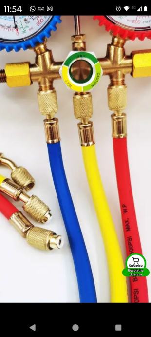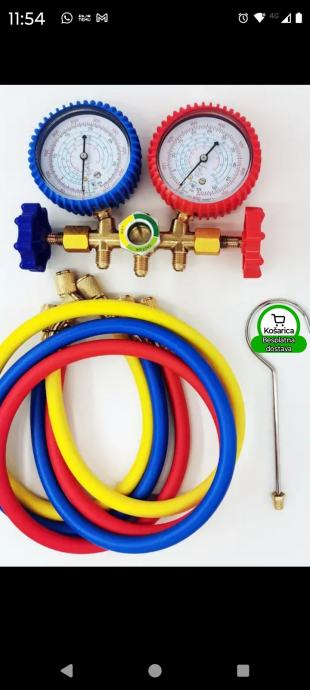 Na prodaju je set za servisiranje i punjenje plinom svih klimatskih uređaja. Podržava plinove R32, R410, R134 i još neke. U setu dolazi vakum pumpa, ulje za nju, manometri, adapteri za kućnu i auto klimu, tri crijeva.