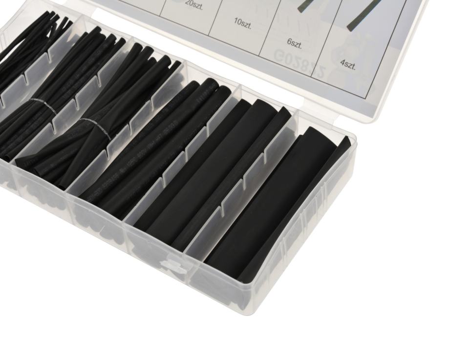 Set visokokvalitetnih termoskupljajućih cijevi. Set uključuje 100 komada termoskupljajućih cijevi u 6 popularnih veličina. Navlake štite kabele od vlage i korozije.