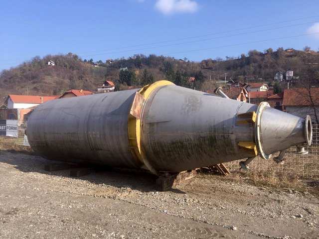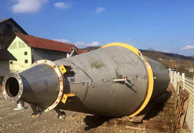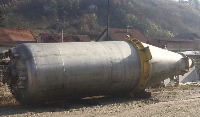 Vanjski silos - spremnik HONORE, Fr., od INOX-a 318, za teško tjecive materiale; škrob, mlijeko i jaja u prahu, puder, gips, lebdeći pepeo, boje u prahu, saharoza, šećer, mljevena kava i slične materijale koji teško istjeću iz silosa, zapremine 23.000 lit. Sastoji se od cilindričnog valjka promjera 2300 mm visine 5100 mm, zatim ekscentričnog konusa visine 3100 mm, ima nastavno izlazni simetrični konus sa izlazom ø 320/500 mm. Taj izlazni konus je iznutra obložen perforiranim limom sa uzdužnim otvorima 0,4x30 mm, kroz koje se upuhije komprimirani zrak za poticanje pražnjenja uskladištenog medija. Na eksc. konusu su 3 visinski i tlocrtno raspoređene sapnice za upuhivanje komprim. zraka. Ukupna visina silosa - spremnika je 8.800 mm. Na kapi silosa su otvori za ulaze medija, nivo pokazivače, aspiraciju, te interventna vrata za održavanje. Jedna bočna vrata za ulaz su i iznad konusa. Spremnik ima “pojas” od savinutog INP 220 profila, na kojem su 3 stope za oslonac na čelične stupove za postavu. Između 2 konusa su 4 stope za donje učvršćenje. Silos je moguće transportirati standardnim tegljačem. Ukupna masa je 2.800 kg INOX a.