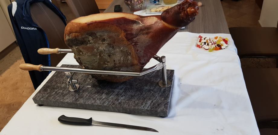 OPIS PROIZVODA: Sastoji se od fiksnog djela koji je fiksiran za stalak potpornom nogom s prednje strane i stupom sa stražnje. Mobilni dio je povezan sa stražnjim stupom sa sistemom za okretanje te sadrži zasebnu nogu kao potporu kod fiksiranja.Novost u ovom proizvodu je jednostavno pričvršćenje kod stiskanja pršuta, tokarenim elementom sa sistemom na navoj.Inox element također sadrži drvene ručke i 2 špice sa svake strane.Granitno postolje je pravokutno dimenzija 250x550 mm, debljina kamena 30 mm, sa gumenim odbojnicima (nogama) za bolju stabilnost na podlozi.Stalak na granitnom postoljuDimenzije postolja: 250x550Debljina kamena: 30 mmDimenzije pakiranja: 270x660x200 mmTežina stalka: 13 kg