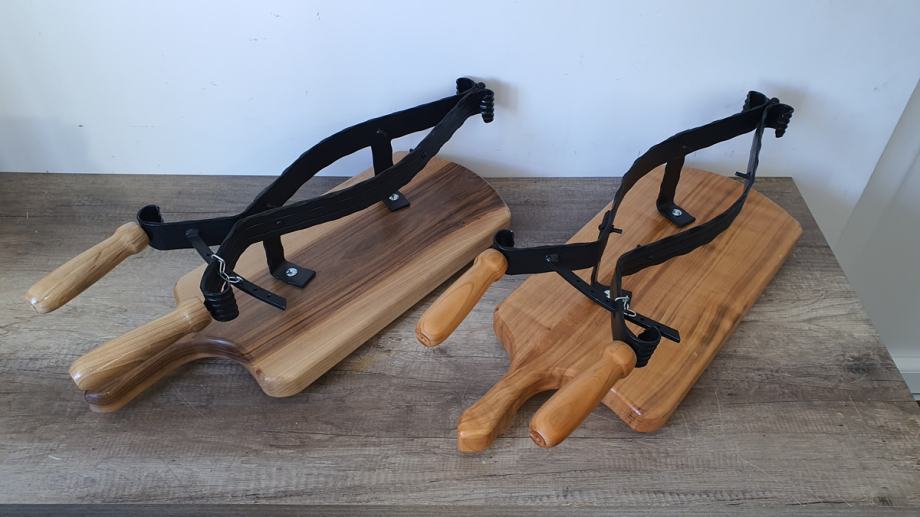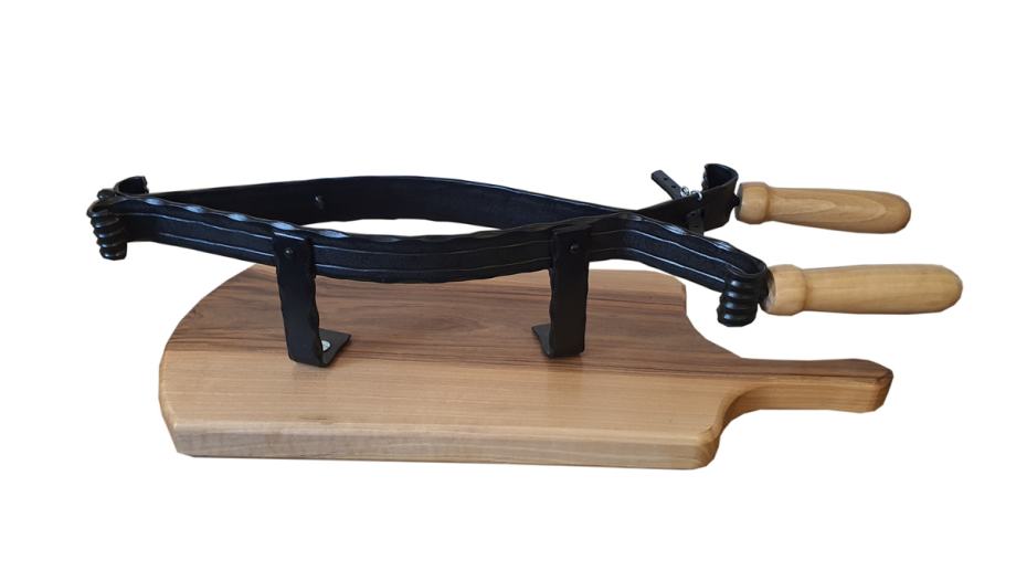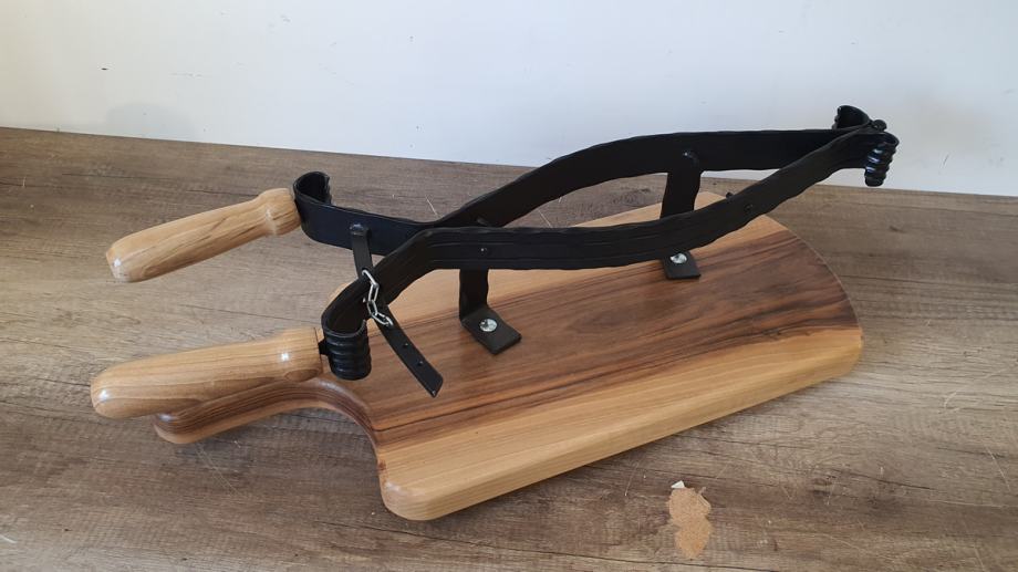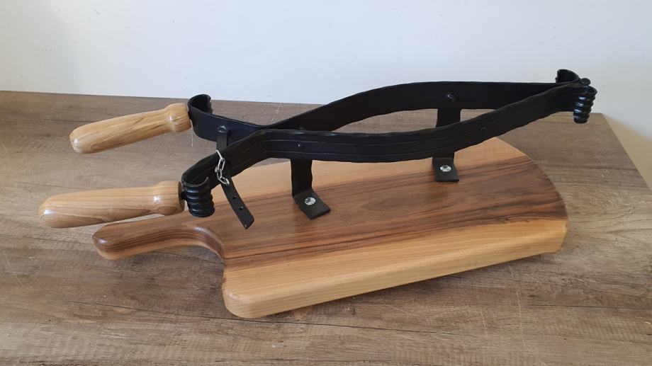 Stalak za pršut od kovanog željeza, sa ručno rađenim drvenim postoljem.Razne vrste drva (orah, hrast, kruška...)Dužina stalka 65 cm - optimalno je za veće pršute i šunkeDebljina drva oko 4.5 cmDrvene ručke (hvatišta)Sistem pričvršćivanja pršuta na klin.Težina stalka oko 7 kg
