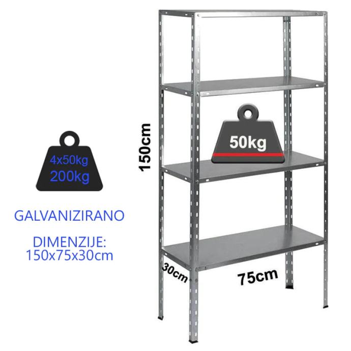 STALAŽA METALNA SA 4 POLICE 150*75*30 / UKUPNA NOSIVOST 200kg / GALVAN