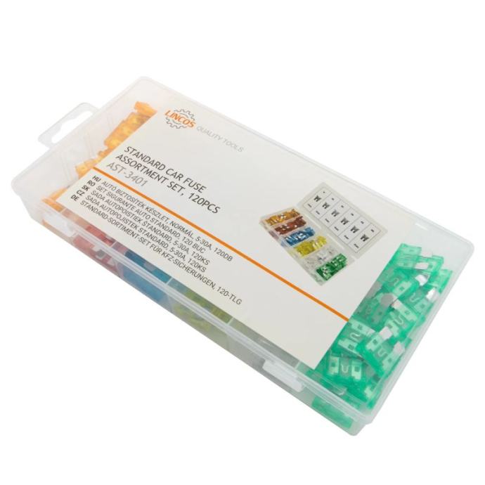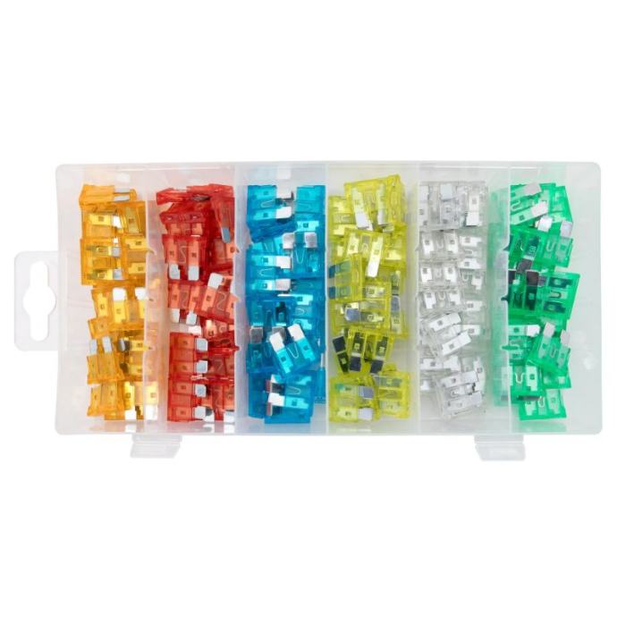 set standardnih osigurača za automobile od 120 dijelova, uključujući šest različitih jačina struje od 5 A do 30 A dizajniran za električnu zaštitu automobila, kodiran bojama za laku identifikaciju i organiziran u plastičnoj kutiji za pohranukompatibilno s automobilima, motociklima, kamionima i drugim električnim aplikacijama od 12V/24VKljučne značajke:120-dijelni set osigurača za automobile – uključuje šest različitih jačina struje (5 A do 30 A)standardni automobilski osigurači – kompatibilni s raznim primjenama u vozilima od 12 V/24 Voznačeni bojama za jednostavnu identifikaciju – omogućuje brzu zamjenu osiguračavisokokvalitetni materijal – pruža pouzdanu i dugotrajnu zaštitupraktična torbica za pohranu – održava osigurače organiziranima i lako dostupnima Tehnički podaci:Vrsta osigurača Amperaža (A) Boja KoličinaStandardni automobilski osigurač5Anarančasta20 komStandardni automobilski osigurač10Acrvena20 komStandardni automobilski osigurač15Aplava20 komStandardni automobilski osigurač20Ažuta 20 komStandardni automobilski osigurač25Atransparentna20 komStandardni automobilski osigurač30Azelena20 kom]]>