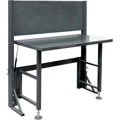 Sklopivi radni stol, praktičan u uskim prostorima, od čelika nosivosti 500 kg. Mogućnos preklapanja radne ploče nošene sa 2 snažna plinska ublaživača (amortizera). Veličina radne ploče 1195x458x20 mm, visina 1.380 mm, a ukupna širina 1280 mm, dubine rasklopljen 648 mm.