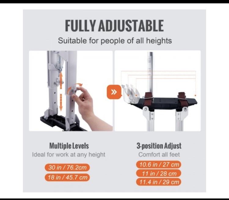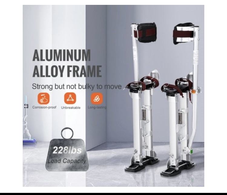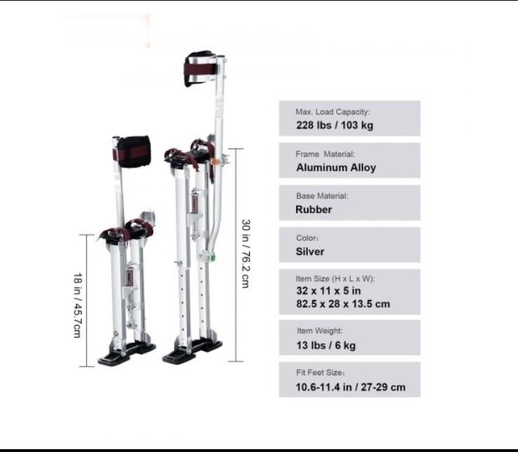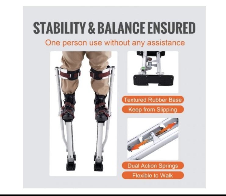 Uz čvrste najlonske trake koje osiguravaju vašu sigurnost, štule za suhozid imaju dvije opruge za amortizaciju udaraca koje održavaju vašu ravnotežu tijekom hodanja, tako da možete lako stajati sami. Štulice će vam pomoći u vašem sljedećem velikom projektu. Gumene nožice na dnu povećavaju trenje o pod kako bi spriječile klizanje i ogrebotine.