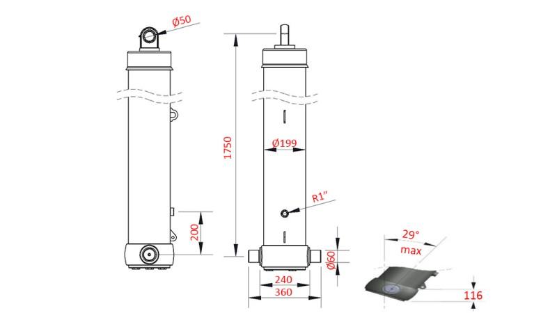 Teleskopski cilindar je snažan i pouzdan. Sastoji se od pet razina. Cilindri su dizajnirani za rad pri radnom tlaku od 180 bara (maksimalno opterećenje 250 bara). Održavanje kiper cilindra je jednostavno - samo s brtvama.