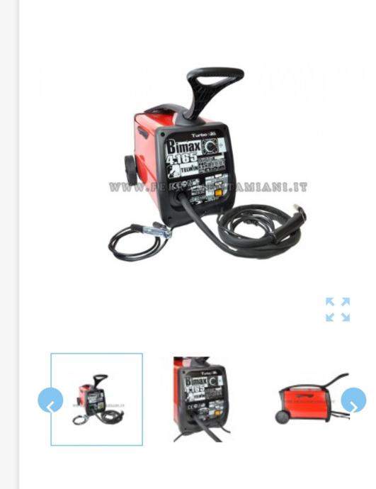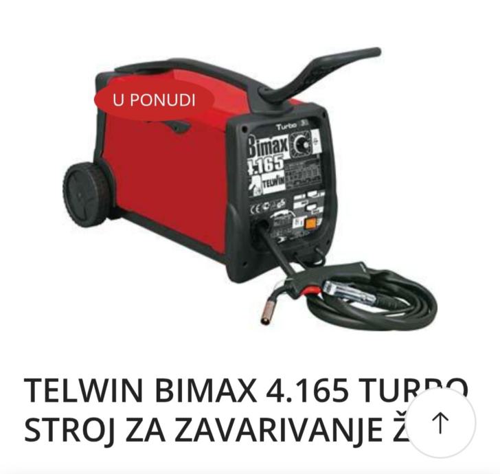 Aparat za zavarivanje žicom s FLUX (bez plina) i MIG-MAG (plin).S termostatskom zaštitom. Napon 230 V. ZaMaksimalna zavojnica 5 kg. Maksimalna apsorbirana snagaKw. 3.7. Raspon regulacije struje 30A-145A.Maksimalna struja 115A – 15%. Promjer žiceČelik: mm. 0,6-0,8. Promjer žice od nehrđajućeg čelika: 0,8.Promjer aluminijske žice: 0,8-1 mm. Promjer žiceanimirano: mm. 0,8-1,2. Priložena oprema zaFLUX zavarivanje: čekićna četka, MIG plamenik, TW160,s kabelom duljine 2 m, stezaljkom za uzemljenjeColorado 150B 150A, kabel od 1,8 m, 16 mm².Težina 23 kg. Dimenzije: 730 × 370 mm, visina 730 × 370 mm.Telwin Bimax 152 Turbo aparat za zavarivanje žicom za MIG, MAG i Flux zavarivanje, sposoban za zavarivanje svih vrsta žica minimalnog presjeka 0,6 mm i maksimalnog 1,2 mm. Aparat ima ulaznu struju od 230 V, minimalnu i maksimalnu amperažu od 30 odnosno 145 A te napon od 31 V.