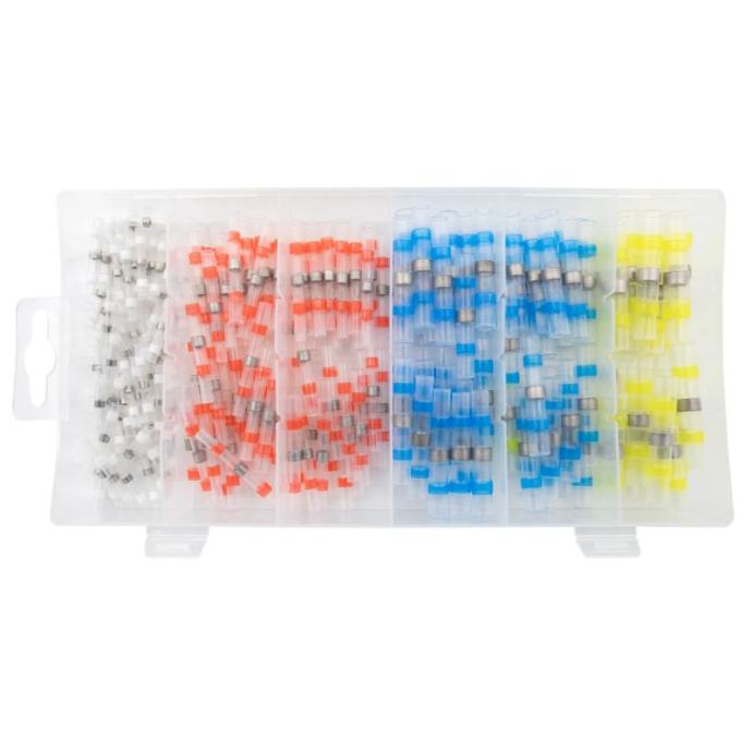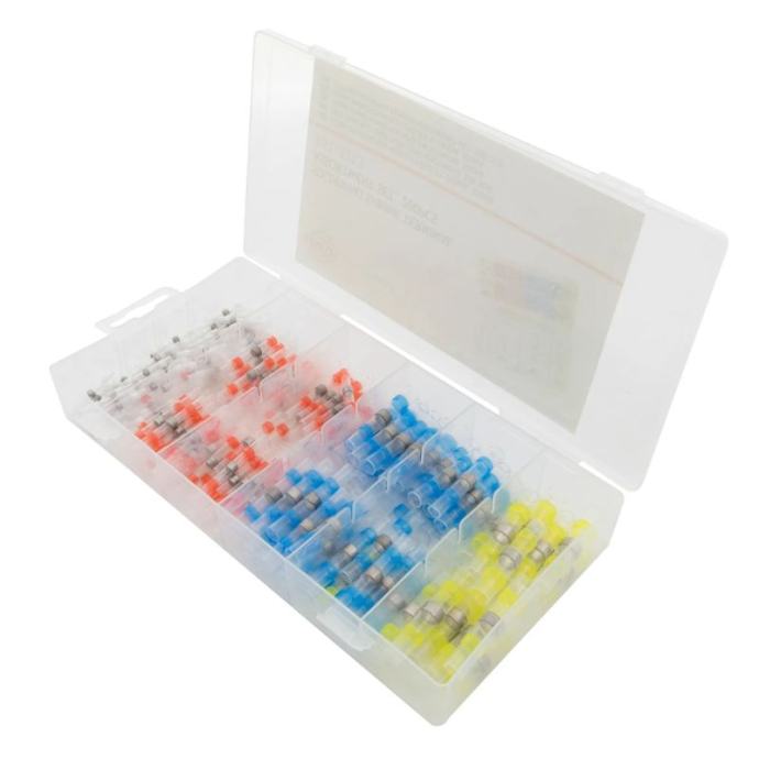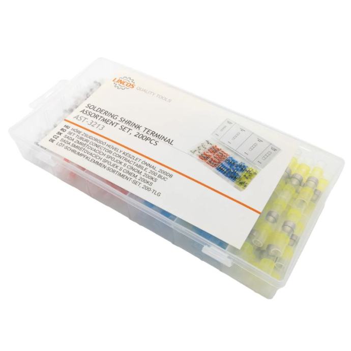 set konektora za lemljenje od 200 dijelova, s četiri veličine žice (26-10 AWG)pruža vodootporne spojeve za lemljenje koji se aktiviraju toplinom za automobilsku, brodsku i električnu primjenucijevi označene bojama omogućuju brzu identifikaciju i jednostavnu upotrebuKljučne značajke:set terminala za lemljenje od 200 komada – uključuje četiri veličine žice (26-10 AWG)lem koji se aktivira toplinom – stvara čvrstu i sigurnu vezutermoskupljajuće cijevi obložene ljepilom – pruža zaštitu vodootpornu i otpornu na korozijudizajn kodiran bojama – omogućuje brzu i jednostavnu identifikacijuraznovrsnu upotrebu – idealno za automobile, brodove, industriju i kućanstvo električni radoviorganizirano skladištenje – dolazi u plastičnoj kutiji s odjeljcimaTehnički podaci:Promjer žice (AWG) Boja Količina26-24 AWGbijela60 kom22-18 AWGcrvena70 kom16-14 AWGplava50 kom12-10 AWGžuta20 kom]]>