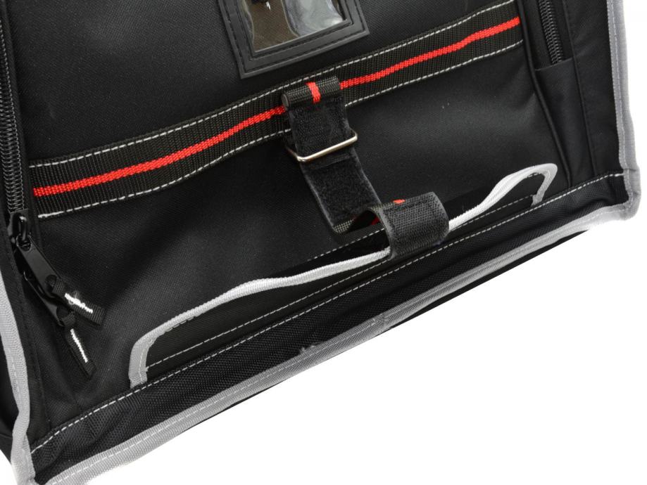 Na prednjoj strani torbe nalazi se džep za dokumente zatvorene patentnim zatvaračem i 6 džepova, uključujući jedan zatvoren čičkom, dodatno kopča i karabiner za alate