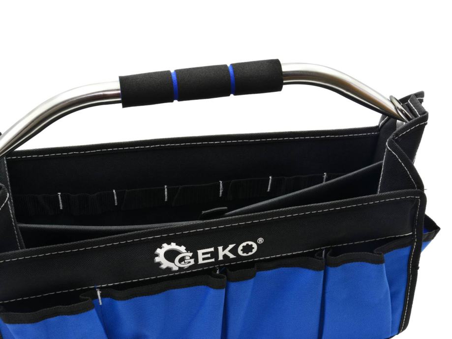 Metalna ručka torbe pruža čvrsto prianjanje i ugodno nošenje, bez obzira na težinu alata u torbi. Pored toga, vreća je opremljena snažnim patentnim zatvaračem koji osigurava sigurno zatvaranje i sprečava gubitak alata tijekom prijenosa.
