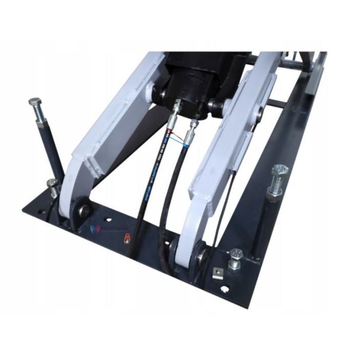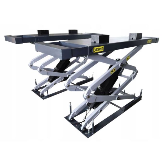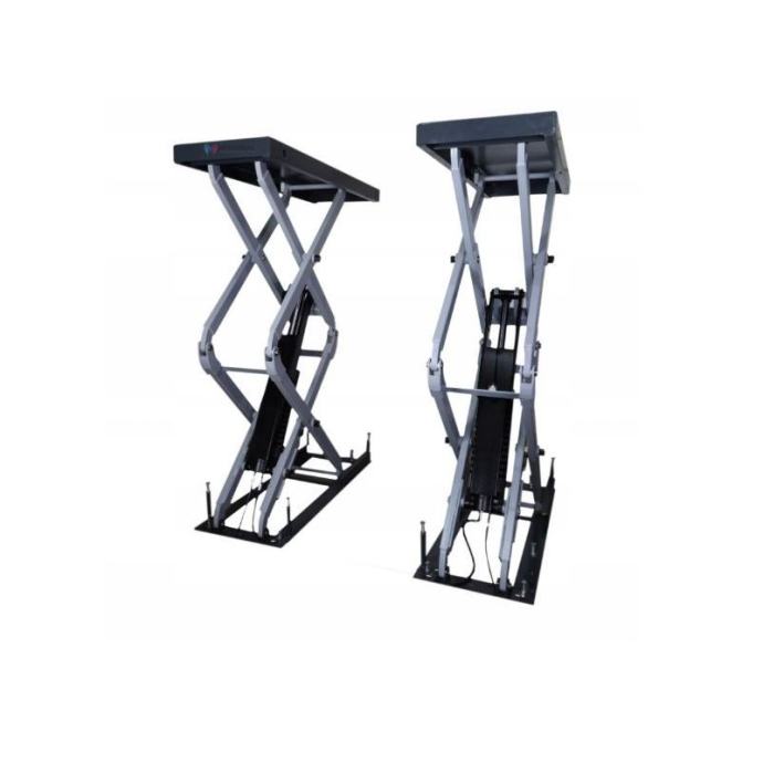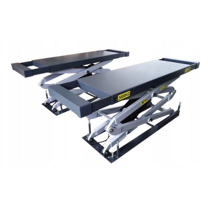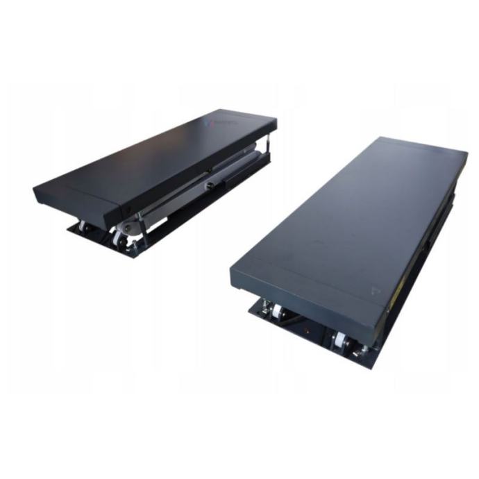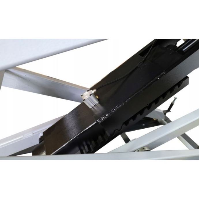 Visokopodizna elektrohidraulična dizalica s mogućnošću izvlačenja platformi na dvije strane. Stabilna potporna konstrukcija. Mehanička blokada visine, pneumatski otpuštena. Mehanički sinkronizirane platforme podesive duljine