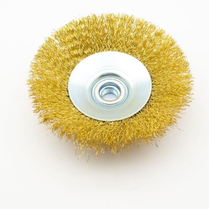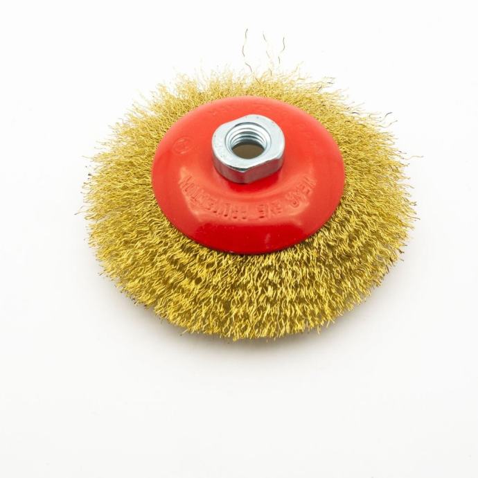 Ova čvrsto napravljena četkica od mesinga namijenjena je godinama korištenja. Čvrsta proizvodnja uključuje čvrste medene žice koje se čvrsto postavljaju u Lite Iron OS s navojnim M14 za upotrebu sa svim standardnim kutnim brusilicama ili mljevenim brusilicama. Debele žice su čvrsto zamotane kako bi se osiguralo maksimalno čišćenje i uklanjanje smeđe, školjke i boje s metalnih površina. Kompaktna verzija od 125 mm (5 inča) omogućuje upotrebu u uskim prostorima za učinkovito čišćenje u tvrdim mjestima -do -na -mjesta. Upotrijebite ga za uklanjanje oštrih rubova, poliranje, mljevenje i preradu metalnih dijelova u industrijskim i kući.