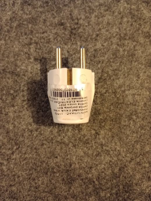 Prodajem nov električni utikač bijele boje. Radi se o okruglom utikaču s dva kontakta, naponske karakteristike 1 kVA / 1 V (vidljivo na naljepnici).