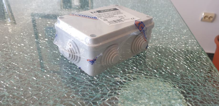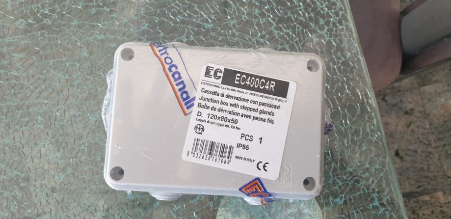 Nadžbukna (N/O) razvodna kutija, proizvođača Elettrocanali, izrađena od ABS plastike sive boje RAL7035, dimenzija 120 x 80 x 50 mm, sa zaštitom IP55 i IK08, ima 6 M25 gumenih uvodnica i vijčani poklopac.