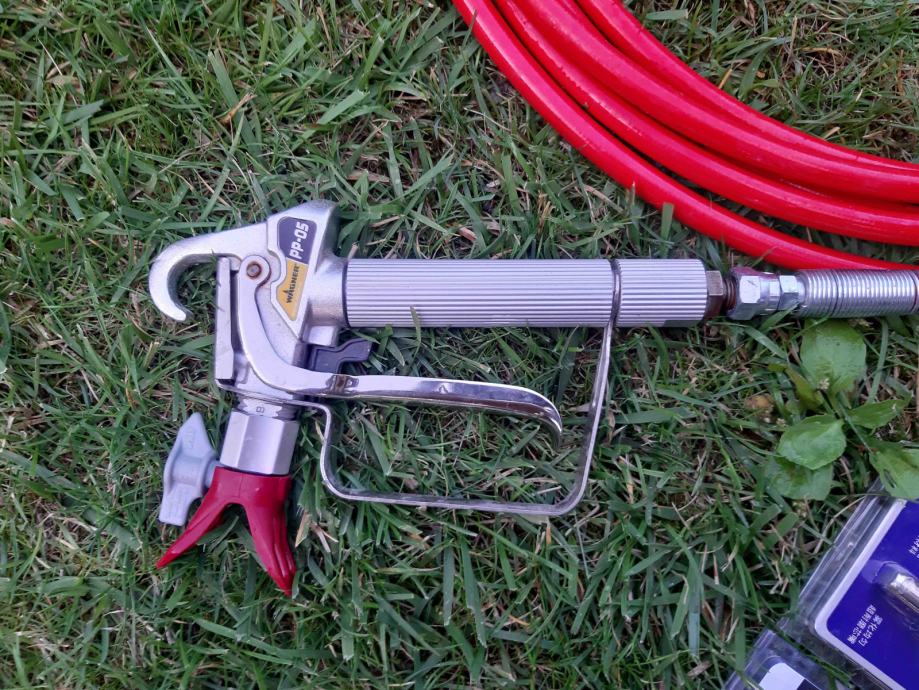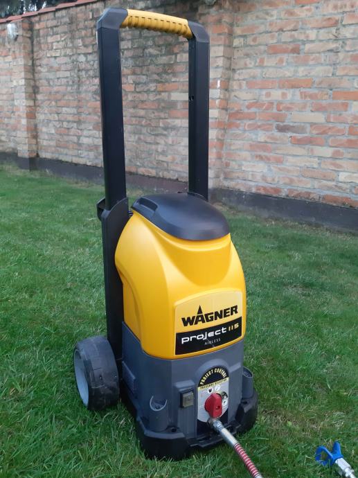 Uređaj za raspršivanje bez zraka, pod visokim pritiskom. Radi sa svim bojama za zidove. Može raspršivati i lakove i lazure.