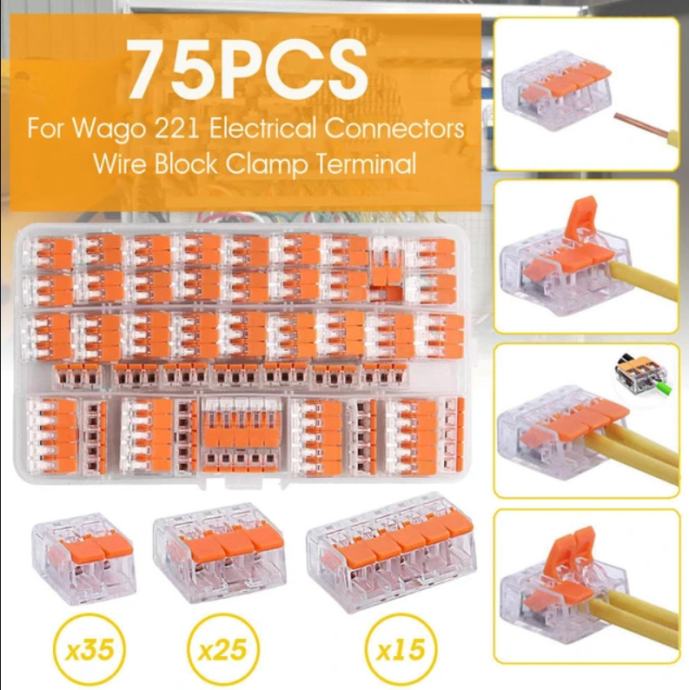 Prodajem nove zapakirane i nikada korištene wago spojnice za električne vodiče. Set se sastoji od 75 komada spojnica različitih vrsta. Spojnice su pakirane u plastičnoj kutiji sortirane po veličini kako je prikazano na slikama.