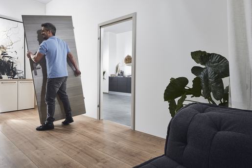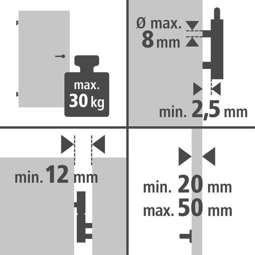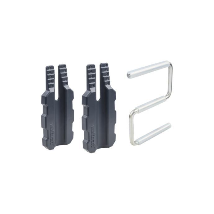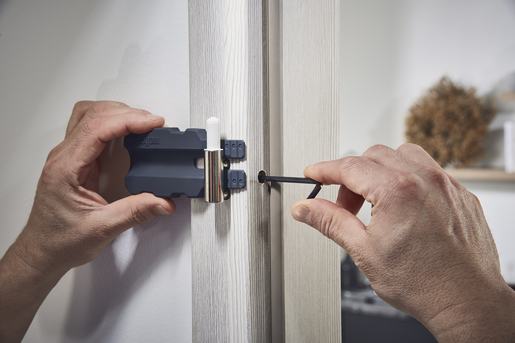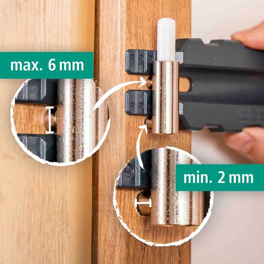 S ovim trodijelnim kompletom za montažu krila vrata možete vješati, ugađati i nositi vrata bez pomoći druge osobe. Sadrži nosač za podizanje izrađen od robusnog čelika i dvije pomoćne vodilice izrađene od izdržljive plastike. Kako biste objesili vrata, gurnite nosač za podizanje između krila vrata i okvira i nagnite ih. Sada možete jednostavno ukloniti i ponovno postaviti vrata. Silikonska manšeta osigurava neklizajući zahvat. Nosač za podizanje može se upotrebljavati za krila vrata debljine materijala od 2 do 5 cm. Obje pomoćne vodilice imaju mjernu skalu s jedinicama od 5 milimetara. Možete ih upotrebljavati za poravnavanje dubine gornjih i donjih šarki okvira. Zatim pričvrstite pomoćne vodilice iza šarke vrata okvira. Zahvaljujući vodilici možete objesiti krilo vrata čak i bez izravnog vizualnog kontakta s klinovima šarki. Idealno ako se trebate snaći bez dodatnih ruku i očiju.