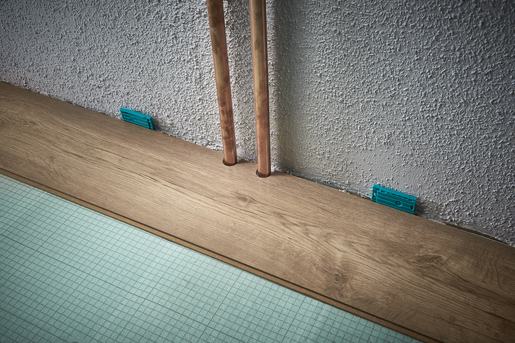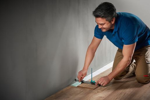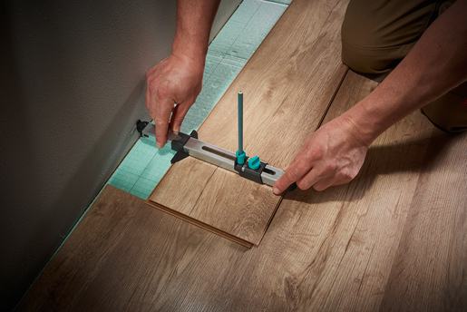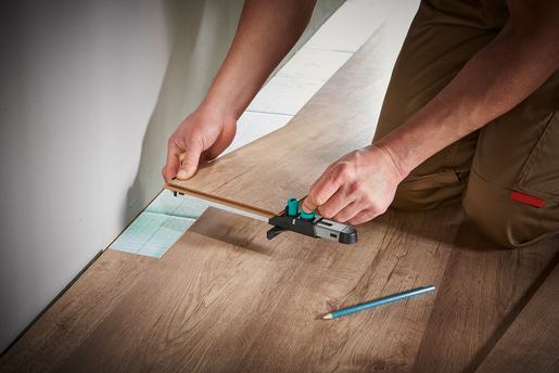 Praktični paket za uspjeh „Prilagodba laminatnog i dizajnerskog poda” tvrtke wolfcraft sadrži sve što trebate za preciznu prilagodbu laminatnih i dizajnerskih podova. Sadržani su univerzalni kutnik, šablona za konture i prilagodnik za laminat. Univerzalni kutnik koristi se već na kraju prvog reda. Pomoću njega možete izmjeriti točnu duljinu zadnje podne daske i prenijeti je na materijal za polaganje. U tu svrhu poravnajte univerzalni kutnik na kraju ruba; pomoću graničnika sada možete označiti tijek rezanja od 90°. Zahvaljujući integriranom razmještaju rupa i skalama univerzalni kutnik idealno je prikladan za prijenos pravokutnih šupljina. Kada želite čisto i bez greške izmjeriti posebne šupljine kao npr. cijevi za grijanje te prenijeti mjere na podne daske, šablona za konture je alat bez kojeg ne možete. Posebno je razvijena za očitanje i prijenos tijeka rezanja. Uz 91 kontaktno ticalo oblikujete konture širine do 130 mm i dubine do 30 mm. Nakon fiksiranja putem blokirne poluge ova odvojena kontura ostat će na svom mjestu i možete je jednostavno prenijeti u sljedećem koraku. Šablona za konture omogućuje vam precizno odvajanje kompliciranih profila te njihovo prenošenje na drugi izradak. Pogrešna mjerenja i netočnosti postaju tako stvar prošlosti. Pomoću prilagodnika za laminat precizno ćete označiti zadnju podnu dasku pri polaganju podnih obloga za točan oblik. Graničnik, klizni kotačić i klizni elementi s oprugom olakšavaju vam udoban i precizan prijenos. Pritom ne uzimaju u obzir samo točan oblik zida, već automatski uračunavaju i ekspanzionu fugu. Tako su od samog početka spriječene greške pri mjerenju. S velikom širinom prilagodbe do 235 mm prilagodnik za laminat možete koristiti kod gotovo svake drvene podne obloge. Različite dimenzije do 250 mm namještate direktno na tračnici.