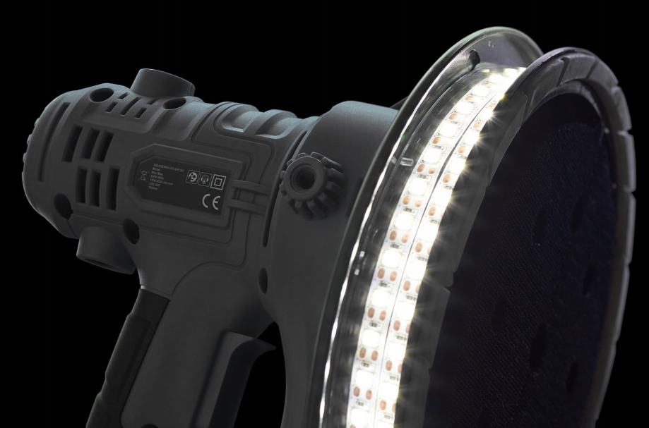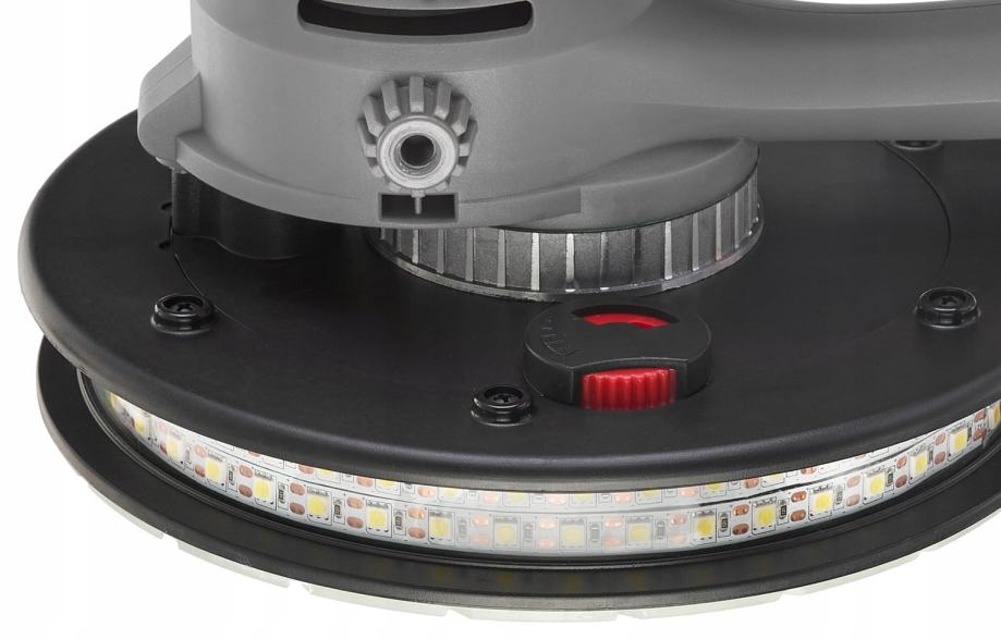Uređaj ima 360 ° LED osvjetljenje oko kotača tako da ne morate koristiti dodatni halogen za osvjetljavanje zida. Radno područje je osvijetljeno točno tamo gdje trenutno brusimo, omogućavajući točniji rad i lakše postići željeni učinak.