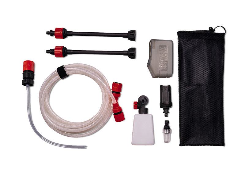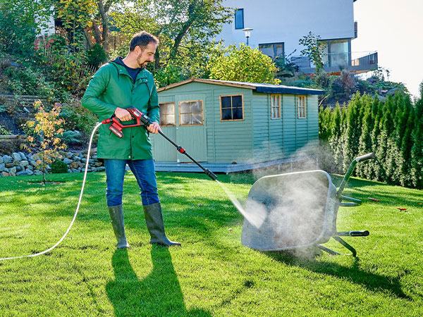 Einhell aku visokotlačni perač HYPRESSO 18/24-1 omogućuje bežičnu fleksibilnost prilikom čišćenja i zalijevanja oko vrta i terase. Akumulatorski visokotlačni perač član je obitelji Power X-Change u kojoj se sve baterije, punjači i sistemski uređaji mogu međusobno fleksibilno kombinirati. Akumulatorski visokotlačni perač radi s maksimalnim pritiskom od 24 bara i maksimalnom količinom protoka od 240 litara vode na sat. Zahvaljujući Eco načinu rada, trajanje baterije visokotlačnog perača može se produžiti pritiskom na gumb. Pištolj za prskanje opremljen je mlaznicom podesivom u 4 moda. Ima točkasti i široki mlaz, kao i raspršivač za navodnjavanje i rotirajući mlaz za čišćenje tvrdokorne prljavštine. Akumulatorski visokotlačni perač ne samo da se može spojiti izravno na vrtno crijevo s pomoću priključka za crijevo, već također može usisavati vodu iz kanti, kanistra ili ribnjaka zahvaljujući usisnom crijevu dugom 5 metara s filtrom za vodu. Uključen je adapter za bocu kako biste mogli koristiti vodu iz standardnih PET boca u pokretu. Uključene su i dvije produžne cijevi, boca s pjenom za raspršivanje koja je idealna za pranje vašeg automobila i mrežasta torba za pohranjivanje pribora. Također je uključen i štitnik od prskanja, koji se jednostavno navlači preko Power X-Change baterije kako bi se pružila dodatna zaštita od vlage. Akumulatorski visokotlačni perač HYPRESSO 18/24-1 isporučuje se bez baterije i bez punjača. Oni su dostupni zasebno. Solo model – isporučuje se bez akumulatora i punjača