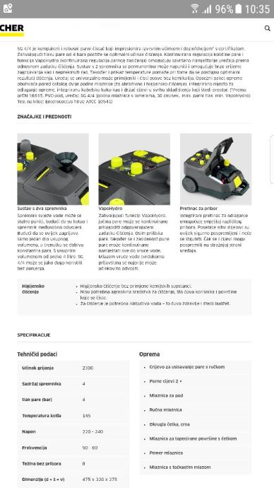 Parni čistač Karcher SG 4/4 je kompaktan i izdržljiv parni čistač koji će vas uvjeriti izvrsnim performansama i certificiranom dezinfekcijom *. Zahvaljujući tlaku pare od 4 bara, možete postići optimalnu učinkovitost čišćenja.