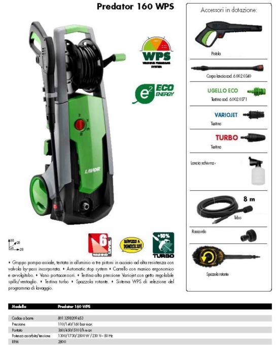Lavor Predator 160 WPS je snažan električni visokotlačni perač namijenjen za kućnu i poluprofesionalnu upotrebu. Pogodan je za pranje automobila, terasa, dvorišta, ograda, fasada, vrtnog namještaja i alata. Uređaj ima kompaktan dizajn s ručkom i kotačima za lakši transport, kao i integrirani kolut za crijevo.