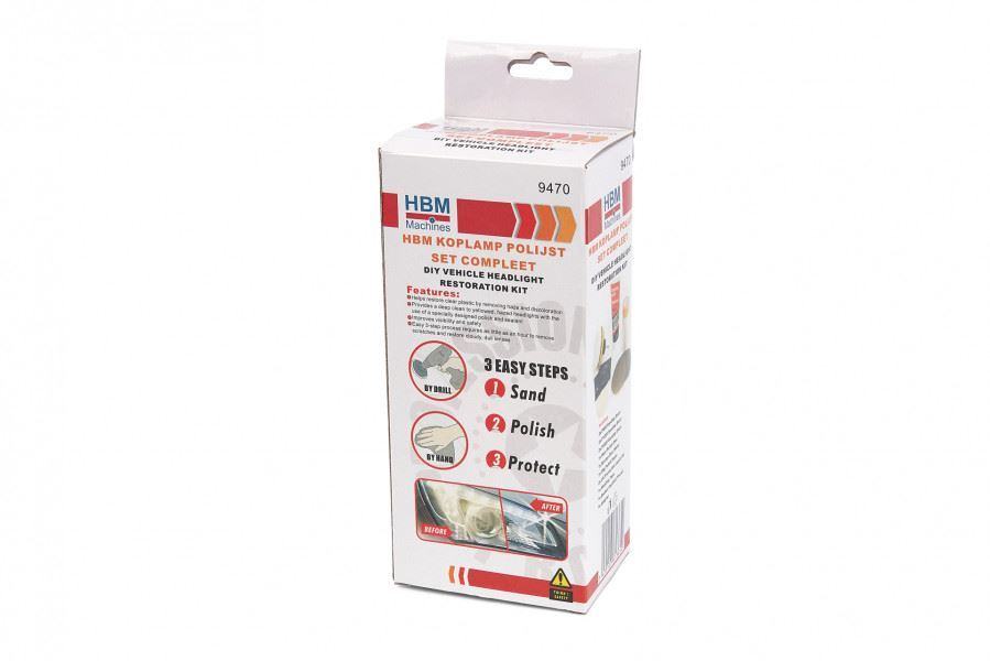 komplet za popravak i poliranje prednjih svjetala na automobilima za uklanjanje ogrebotina, prašina i promjene boje s prednjih svjetala set za poliranje prednjih svjetala čini da svjetla automobila ponovno izgledaju kao nova, tako da imate koristi od optimalnog svjetlosnog učinka za bolju vidljivost na cesti!ovaj komplet za popravak prednjih svjetala automobila može se primijeniti na plastične površineovaj komplet za popravak sadrži sve proizvode za potpuno popravljanje oštećenih, zatamnjenih i žutih farova i za njihovo dovođenje u novo stanjenakon tretiranja s setom za poliranje prednjih svjetala, prednja svjetla ponovo izgledaju kao novaza uklanjanje farova nije potrebno demontirati automobil iz automobila. Zbog toga ste u mogućnosti ovo poliranje odraditi lako i samiovaj set za poliranje prednja svjetla može se koristiti i na drugim plastičnim površinama, na prozorima plovila, vizirima kaciga, vjetrobranskim staklima, stražnjoj rasvjeti na autombilu i osvjetljenju prikoliceda biste ispravno ispolirali prednja svjetla na automobilu, preporučujemo da izvršite sljedeće korake:1.korak: očistite plastiku prednjeg svjetla vodom, te dobro očištite od prljavštin, pregledajte dobro leće da točno definirate gdje ima sve ogrebotine2.korak: s vodobrusnim papirom s tri različite veličine zrna polirajte za potpuno uklanjanje žutila, prljavštine i hrđe. Koristite brusne diskove od grube do fine: P800, P1200, P20003.korak: na držač pričvrstite narančasti polirajući disk i nanesite polirajuću pastu. Polirajte leće prednjeg svjetla dok je sjaj ne vrati u novo stanje. Za najbolji rezultat koristite električni stroj za poliranje ili bušenje. Ako polirate ručno, polirajte ih u smjeru kazaljke na satu najmanje 200 kružnih pokreta4.korak: očistite leću prednjeg svjetla i provjerite je li suha prije nanošenja zaštitnog sloja. Upotrijebite bijeli polirajući disk iz kompleta. Nanesite zaštitnu tekućinu ravnomjerno na površinu farova. Pazite da ovo ne nanesete izravno na sunčevoj svjetlost. Zaštitna tekućina će u potpunosti očvrsnuti formirati sloj na prednjem svjetlu. Pustite da se tekućina suši najmanje 2 sata na izravnom suncu. Nakon koraka 3, leća prednjeg svjetla trebala bi ostati suha 24 sata]]>