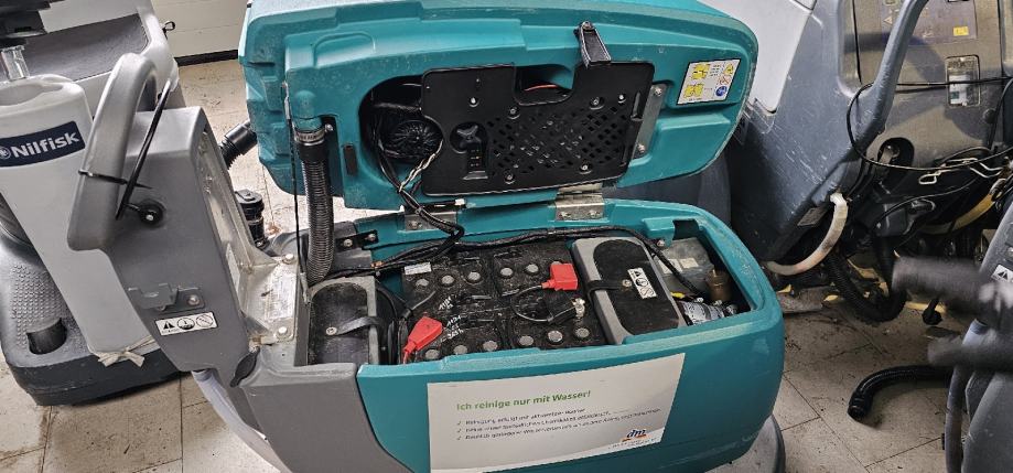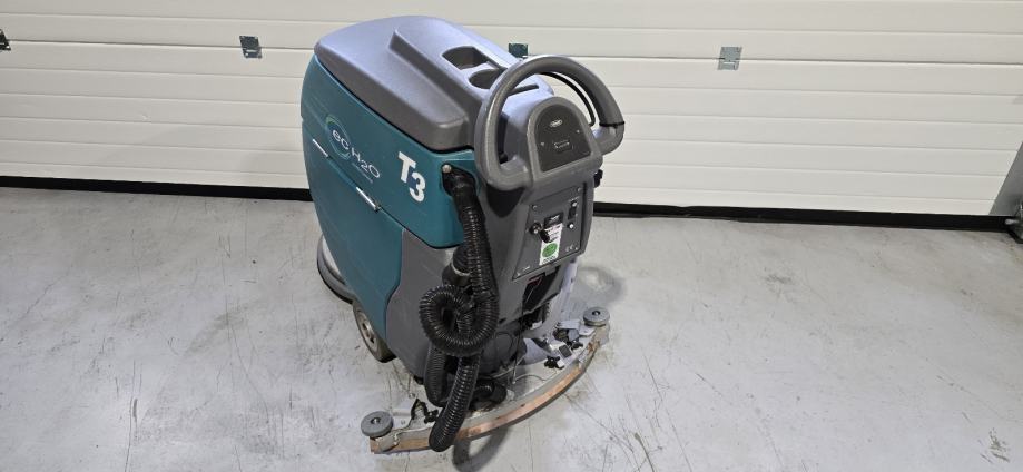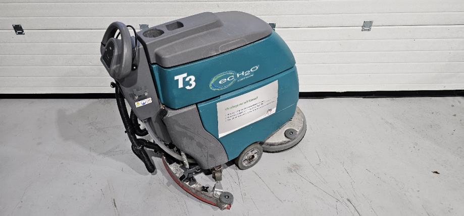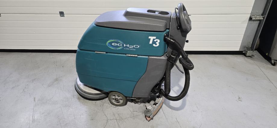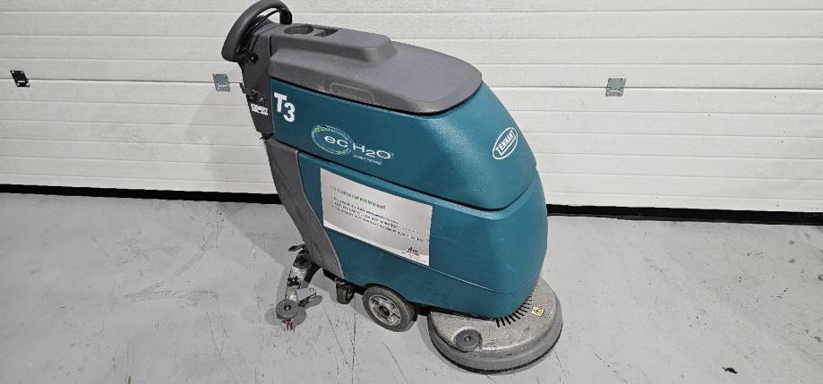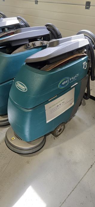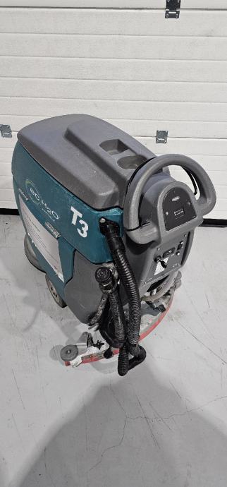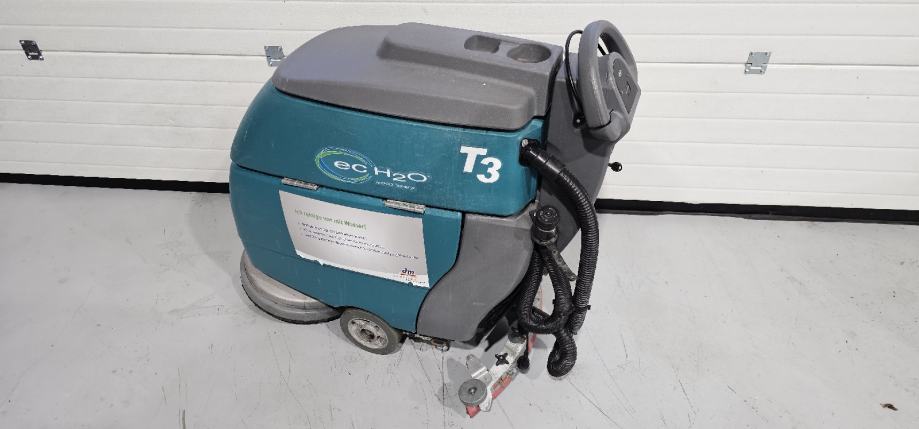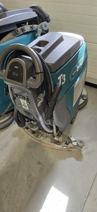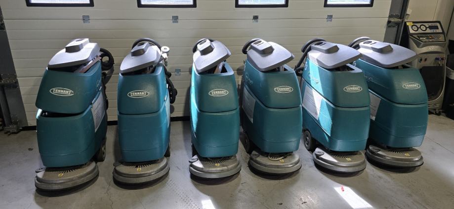 Profesionalni strojevi za pranje i čišćenje podova marke TENNANT T3 sa četkom i sa usisavačem. Strojevi rade na baterije te imaju svoj integrirani punjač.