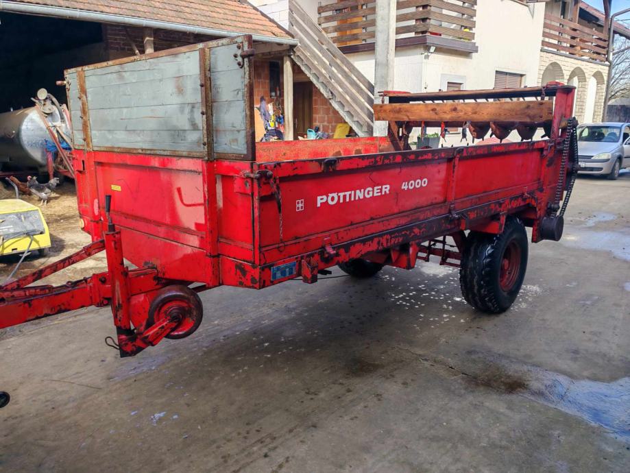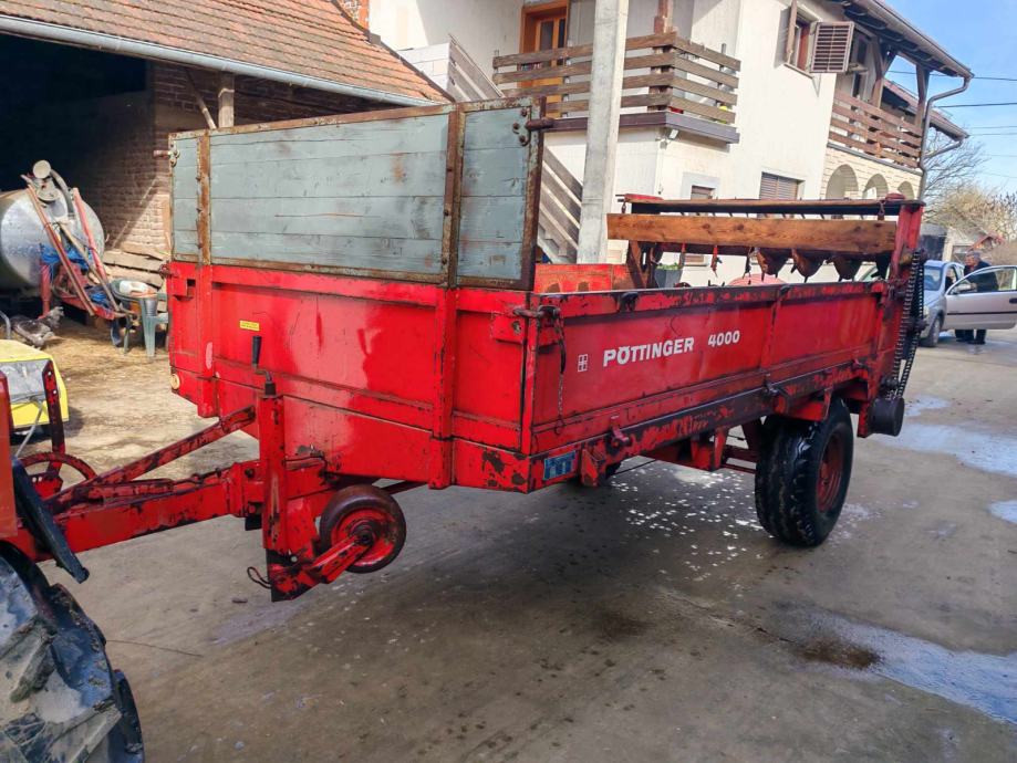 Prikolica za gnoj Pottinger 4 tone, vodoravni valjci, dobro stanje. Stranice zdrave, nisu trule. Prikolica ima nastavke tako da moze voziti kukuruz ili drugo. 095/900-5737