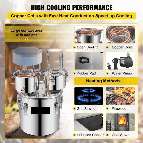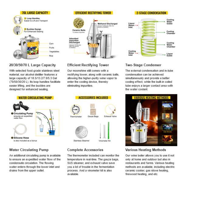 Pogodan za početnike i stručnjake, s izvrsnim učinkom hlađenja. Može se koristiti za destilaciju voćnog vina, vode, rakije i eteričnih ulja, za različite načine grijanja kao što su plinski plamenici, drva za ogrjev i električne ploče.