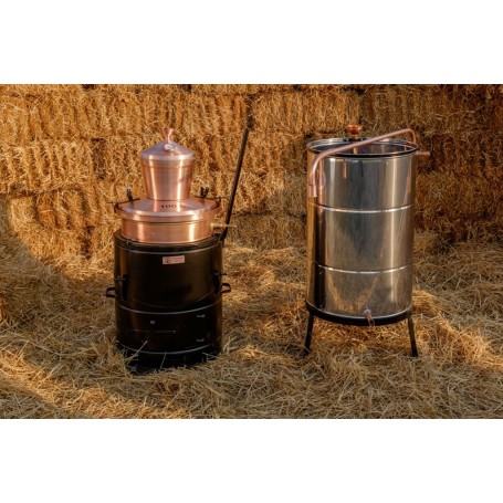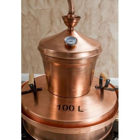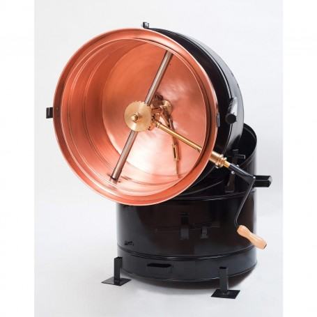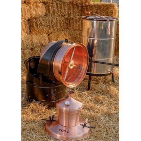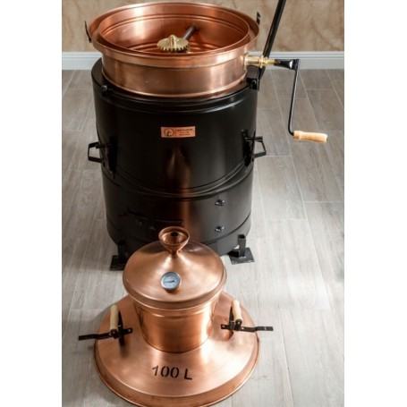 Kotao za rakiju prevrtač od 100 litara sa miješalicom je proizvod namijenjen proizvodnji rakije u srednjim količinama, namijenjen kućnoj upotrebi u malim prostorima. Za grijanje se može koristiti čvrsto gorivo ili gorionik spojen na butan bocu. Kotao za rakiju se puni sipanjem komine kroz gornji otvor i prazni se prevrtanjem koristeći sistem dvodijelnog ložišta.