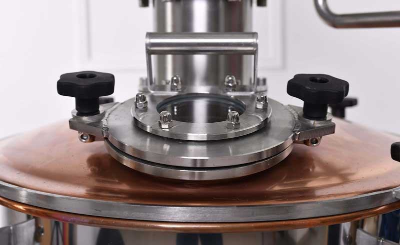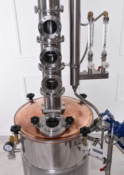 Sekcija pločastog stupa: Sastoji se od odgovarajuće raspoređene ploče i preljeva. Preljev osigurava maksimalnu visinu razine tekućine na ploči. Možemo provjeriti razinu tekućine. Što je viša razina tekućine, to je destilat koncentriraniji. Snižavanjem razine tekućine ili isključivanjem ploče, "teže" komponente arome mogu lakše ući u destilat.
