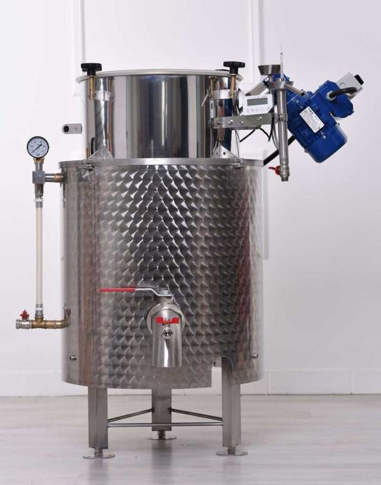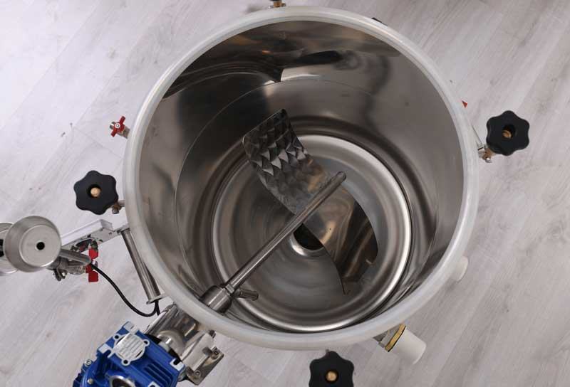 Kada se komina izlivena u destilaciju mehanički miješa, proces prijenosa topline u kaši dovodi do brzog i dinamičnog zagrijavanja. Miješanje je osigurano odgovarajućim motorom s reduktorom visokog zakretnog momenta (230 V, 20 do 25 Nm) i robusnom lopaticom za miješanje.