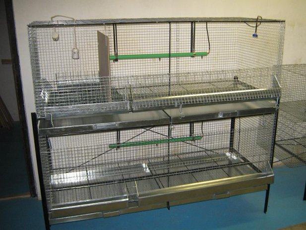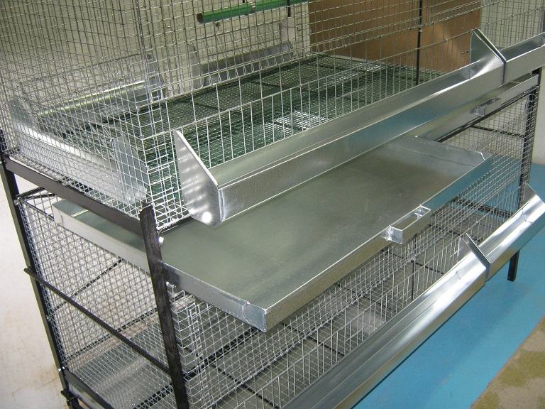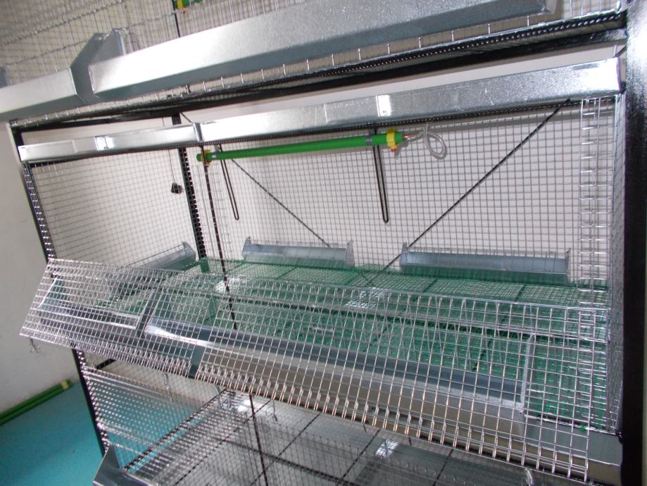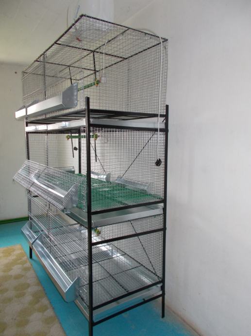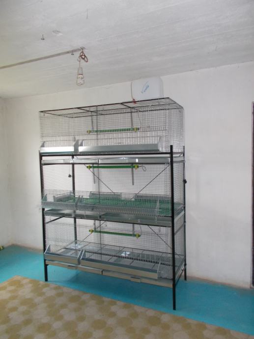 U najvećoj većini slučajeva ljudi traže set na kat 50 do 60 pilića u tovu, to su u biti dvije gajbe napravljene od najkvalitetnije BETAFENC mreže, a podovi posebno imaju 3x pocinčanu mrežu, dimenzije svake pojedine gajbe je: dužina 152 cm, širina 61 cm i visina 50 cm, a visina seta sa dvije gajbe u konstrukciji je približno 140 cm i težina ne prelazi 50 kg, mogu biti i tri gajbe za ukupno do 90 pilića Gajbe se normalno mogu izvaditi iz metalne konstrukcije kako bi se ona nakon nekoliko godina mogla na novo ofarbati a gajbe bi se na kraju sezone mogle očistiti. Slika na internetu prikazuje taj set pa ako trebamo samo za 30 pilića onda nam je važna gornja gajba. Detalj gdje dolaze pilići u oba slučaja prvi dan i provode slijedećih 10 dana prikazuje slika za 25-30 pilića ili za 50-60 pilića a to je kad gledate gornju gajbu samo onaj dio na lijevoj strani gdje je jedna montažna pregrada. Tu pilići imaju jednu hranilicu na slici lijevo, jednu pojilicu ravno naprijed a one imaju na sebi sistem za podešavanje rupa za veličinu glava u jednom potezu da ne bi mogli rastepati hranu ili se namakati u vodi, potom mrežu plastičnu na postojećoj za zaštitu nogu, potom pregrada da se zaustave na malom prostoru kako bi ih sijalica za koju je postavljena instalacija grijala dovoljno ali ne previše, s tim da najprije oslobodite ili maksimalno podignete linijsku automatsku pojilicu jer vam ona ne treba do 10 dana starosti . Takva mini farma košta 510,00 eura. a samo jedna gajba 310 eura. Nakon 10 dana sve se to skida van i pilići se puštaju po cijeloj gornjoj gajbi gdje imaju linijsku automatsku pojilicu koju sada spustite najniže, a ona se jednim potezom podešava po visini kako oni rastu tako da oni stalno piju istegnutog vrata, a kompletna razvodna mreža za vodu ide iz jednog karnistera 10- 12 litara kojeg dobivate u kompletu a za one koji hoće riješiti vodu za stalno mogu za (30,00 eura) isporučiti sistemom da se priključi na vodovod direktno tako da na vodu više ne morate misliti, potom koriste vanjske hranilice koje su po dvije i to Vam je za slučaj da ako se dio pilića razboli onda uvijek možete postaviti pregradu i u hranu bolesnima staviti lijek, cijele linije na obje gajbe se jednim potezom podešavaju ponovno rupe za izlaz glava prema hranilicama da ne mogu rastepati hranu. Nakon slijedećih 10 dana (što znači kada su 20 dana stari) pola pilića (ako ih je 50- 60) stavite u donju gajbu i tako do klanja. Ako se radi o tri kata za 75-90 pilića, tri zadnje slike onda u srednju gajbu dolaze prvi dan i unutra su 2 hranilice i 1 pojilica i plastična mreža za prvih 10 dana i nakon toga 1/3 stavljate u gornju 1/3 u donju i jedna trećina ostaje u srednjoj gajbi. (obavezno vadite plastičnu mrežu hranilice i pojilice) i sve puštate na vanjske hranilice i automatske pojilice i tako do kraja. ova varijanta vam košta 650 eura. Ispod svake gajbe su dvije takozvane tace za izmet koje imaju zavrnute stranice 4 cm i zalotane su u ćoškovima tako da ništa ne može curiti vam i imaju po jednu ručku za lakše rukovanje (vidite na slici gdje je jedna taca malo izvučena). Sve zajedno je na metalnim nogama od L profila tako da je dovoljno čvrsto i lagano.