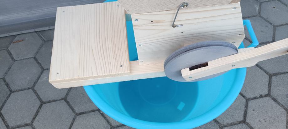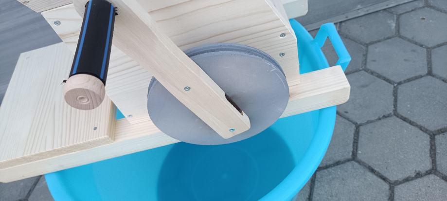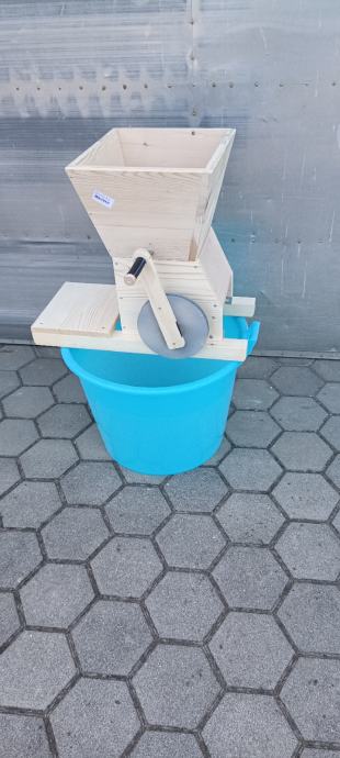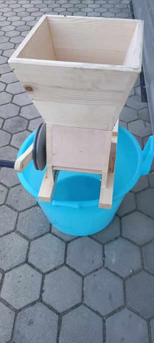 Prodajem eko mlin,drveni,sa inox noževima za ribanje i struganje boca ,jabuke kruške,kupine ,maline aronija i dr.Specifikacije na slikama.Pogon to ucni na ručku.Moze se ugraditi i elektromotor od npr veš mašine.,ima utor za klinastii remen u pogonskoj remenici.Cijena 199 e.,Moguča dostava postom.