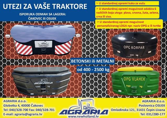 U ponudi imamo prednje traktorske utege. Utezi su izrađeni od posebne vrste betona što omogućuje veliku hektolitarsku masu. Konstrukcija utega izrađena je od visokokvalitetnog čelika.