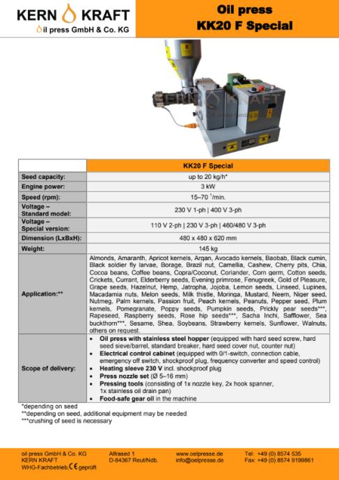 PREŠA ZA HLADNO PREŠANJE ULJA - KERN KRAFT KK20F SPECIAL