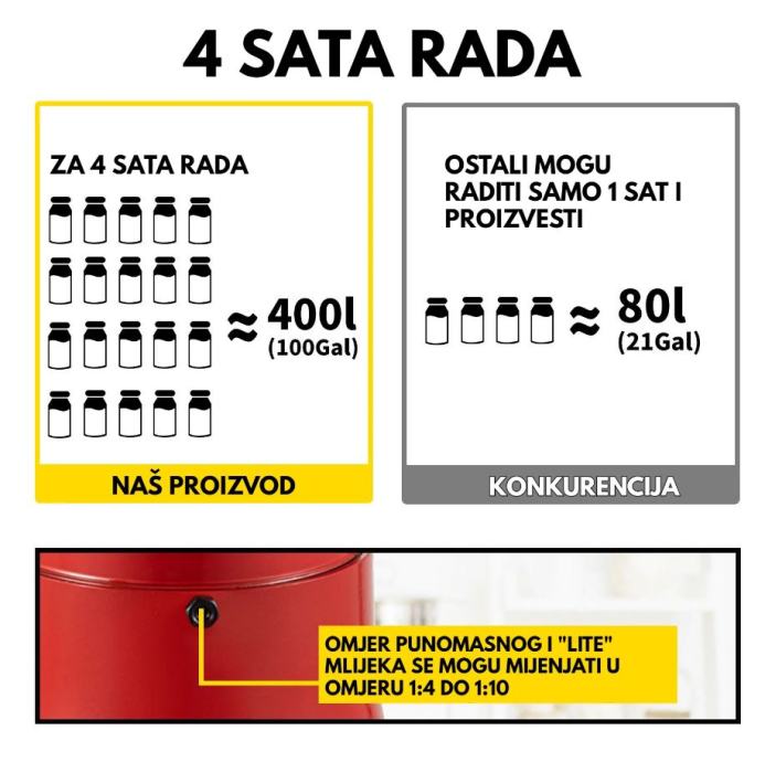 Sposoban u kontinuitetu raditi 4H i za to vrijeme obraditi 400litara mlijeka!!!