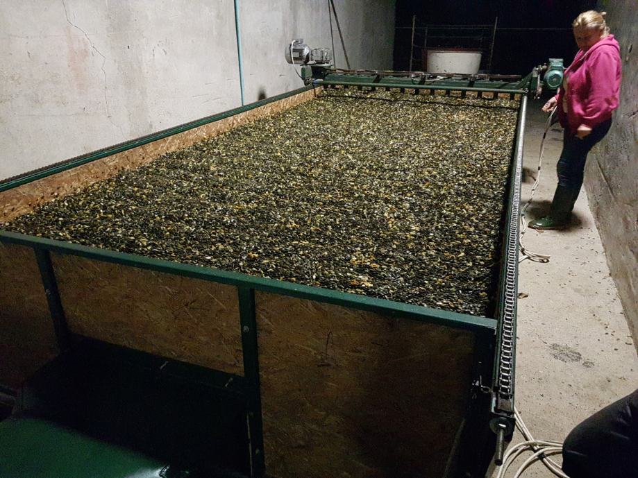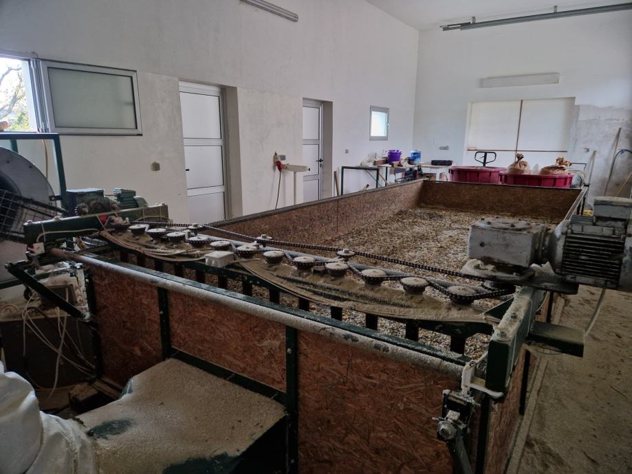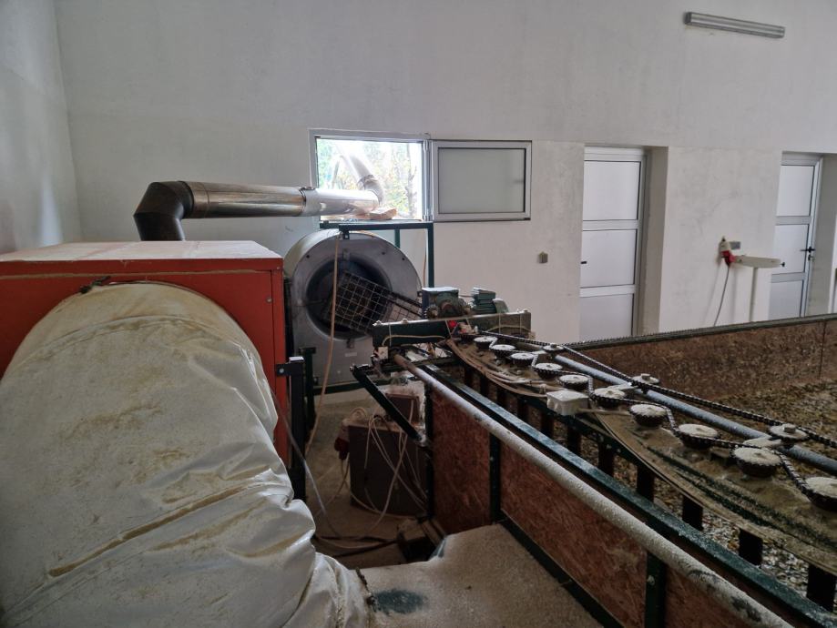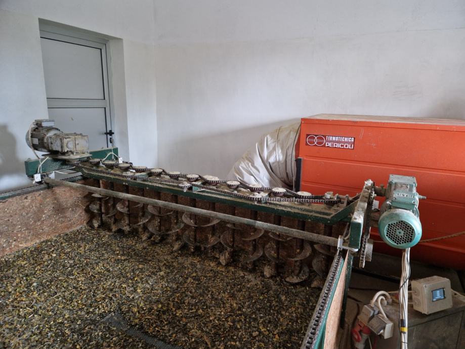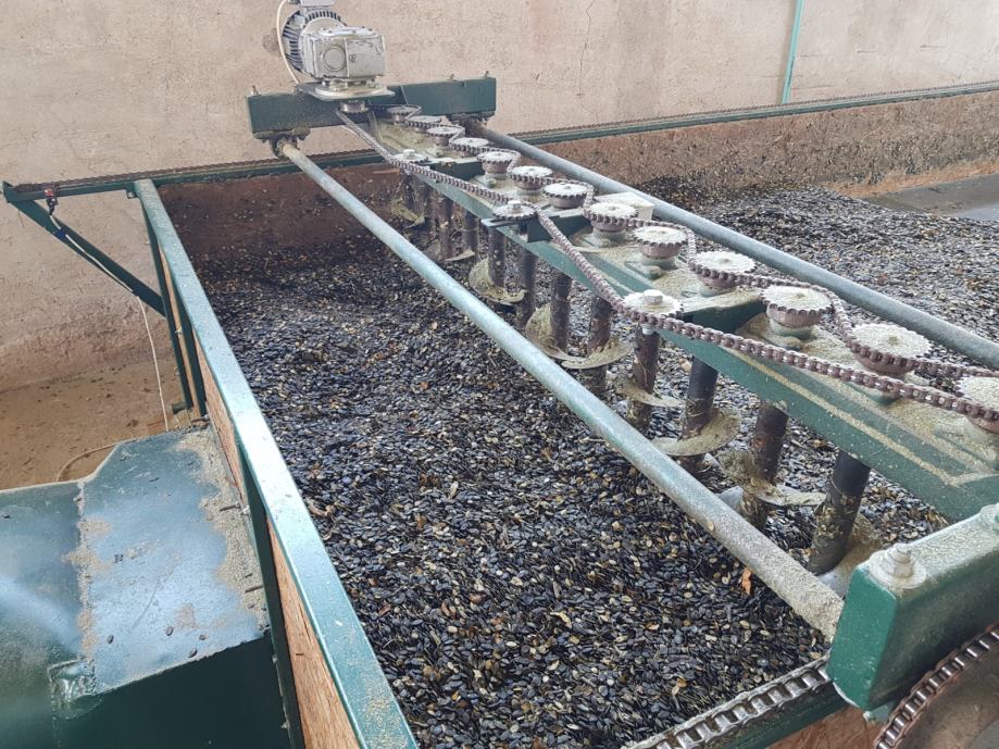 Sušara je dimenzije 5x2 metra, dubine 30 cm, što daje 3000 l odnosno 3 kubika prostora za sušenje, te u nju stane 2200 kilograma mokre bučine koštice. Mješalica konstantno miješa koštice što ubrzava proces sušenja te time štedi gorivo i vrijeme, sve se koštice podjednako zagrijavaju i ne događa se to da se na dnu, pri rešetki stvori nepropusni sloj slijepljenih koštica koji blokira protok toplog zraka i time produžuje vrijeme sušenja. Prilikom pojave te "kore" neminovno je da se te slijepljene koštice pregriju, dok se koštice na površini hlade.