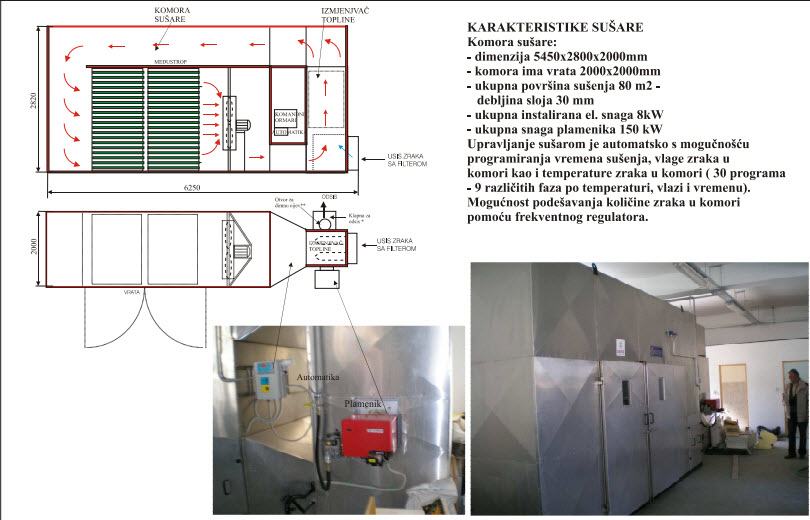 Izrađena iz čelične konstrukcije, izolirana izvana i iznutra, obložena aluminijskim limom. Tavice za sušenje su od inoxa. Vrata sušare sa staklenim prozorom. Energent plin ili lož ulje.