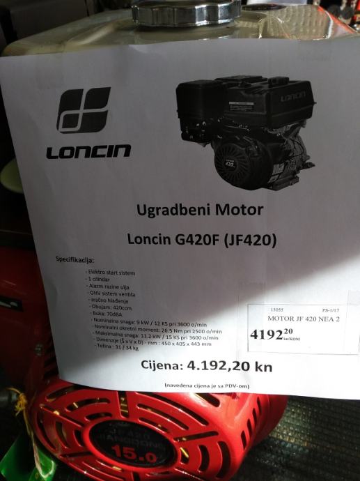 Četverotaktni, zrakom hlađeni, benzinski motor LONCIN G420F (JF420)