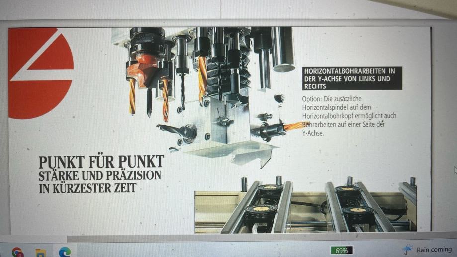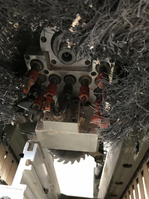 Pila radi samo po x osi tj , po duzini 2, 4 m stroja stroj ima dvije nule lijevo i desno tako da može raditi dugačke ploče od 2,8 m . Znači stroj radi sve što je potrebno za bušenje na iverici za kuhinje i ormare tj pločasti namještaj .Pila može odsječi ali nije namjenjena za rezanje iverice nema predrezača da bude čisti rez . Pila služi za nutove za lesomal -leđa elemenata .Stroj ima glavni motor za glodalo koje može izrezati krug ili elipsu na iverici . - znači glodalo stoji okomito na ploču .. Za namještaj po mjeri i kuhinje izradu ima sve što je potrebno