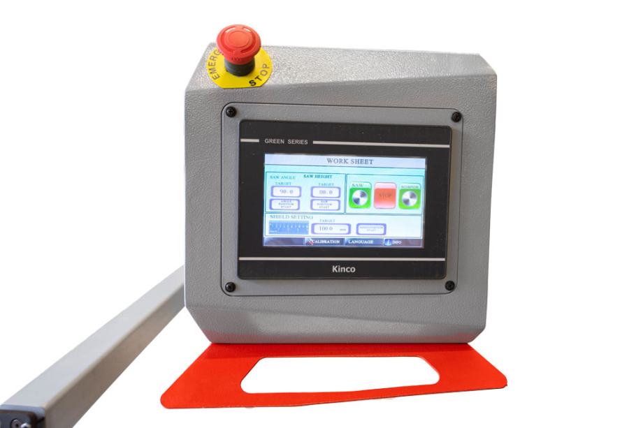 HOLZMANN FKS400VF32Gold_400V pila s kliznim stolom ima, osim podešavanja visine lista pile ili nagiba lista pile (90-45°) koji se mogu podešavati na zaslonu, ogradu s pozicioniranjem putem rotacijskog vretena i servo motora.
