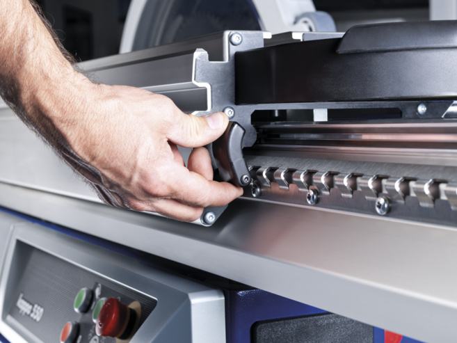 - Klizni stol iz anodiziranog aluminija, X-Roll vodilice (10 godina jamstva), dužina voza (=dužina reza) 2200mm – 3700mm