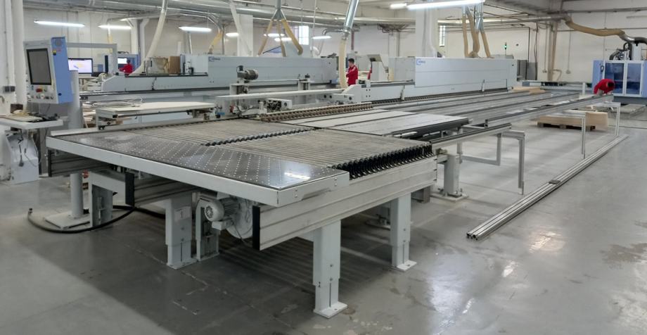 1 HOMAG PROFI TBL 100/35/12 Stol za dovođenje s potpuno automatskim WZ10 sustavom za povlačenje izratka različitih dimenzija u uzdužnom i poprečnom smjeru.