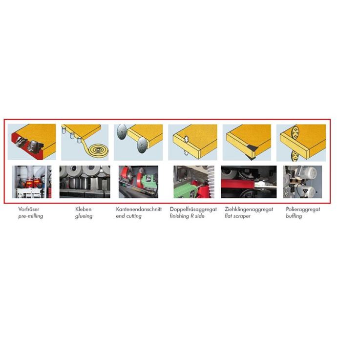 Uspostavljeni KAM215EPS proširen je jedinicom za predglodanje- zaslon osjetljiv na dodir- jednostrano automatsko rubno trakiranje s -jedinica za predglodanje (dvostruka rotacija rezača lijevo/desno) s opremljenim rezačem ø80 mm; Motor od 1,1kW po jedinici i 12000min-1 brzina rezača -spremnik ljepila s kontrolom grijanja i izravnom isporukom ljepila na ravne izratke -poprečna pila za rezanje rubne trake (po jedna jedinica za prednju i stražnju stranu) 0,35kW motor po jedinici i 12000min-1 (brzina lista pile) -dvostruka jedinica za obrezivanje za obrezivanje rubnog prevjesa na radnom komadu (gornji/donji) s rezačem oblika ravno ili polumjera 2 mm; Motor 0,75KW po jedinici i 18000min-1 -ravna jedinica strugača (gornja/donja strana) -jedinica za poliranje (gornja/donja) 0,18 kW po jedinici i 1400min-1- tlačni valjci osiguravaju idealnu vezu između laminata i obratka- automatsko i konstantno dodavanje ploče zahvaljujući pogonu lančanog transportera i snažnom motoru- temperatura lijepljenja može se elektronički namjestiti na zaslonu osjetljivom na dodir- stol za potporu rubnih trakaUključeno u isporuku: 2x glodala (ø80xø20x55 mm), 2x lista pile (ø104xø22x3/2,2 30T), 2x disk za poliranje (ø150mm), 2x oštrice, 2x glodala za dvostruku glodalicu TEHNIČKI PODACI:Podaci o motoru:napon 400V / 50Hzbrzina dovoda 13 m/minMjere:usisni otvor u mm 2x ø 100ukupne dimenzije u mm 3570 x 1100 x 1500Mjere obratka:min. duljina obratka u mm 120min. širina obratka u mm 80min. debljina obratka u mm 10maks. debljina obratka u mm 50Savijanje rubova:širina ruba u mm 15-55debljina ruba u mm 0,4-3potrebni tlak zraka u barima 6Težina:bruto težina u kg 1.050neto težina u kg 900Ambalaža:širina pakiranja u mm 760dužina pakiranja u mm 3.160visina pakiranja u mm 1.500