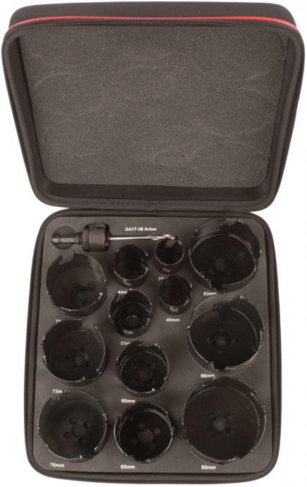 Trinaest-dijelni set se sastoji od kruna promjera 35, 40, 44, 51, 60, 65, 70, 73, 76, 83, 86, 92mm, i prihvatom kruna XA17-38 sa produljenim karbidnim centralnim pilot svrdlom.