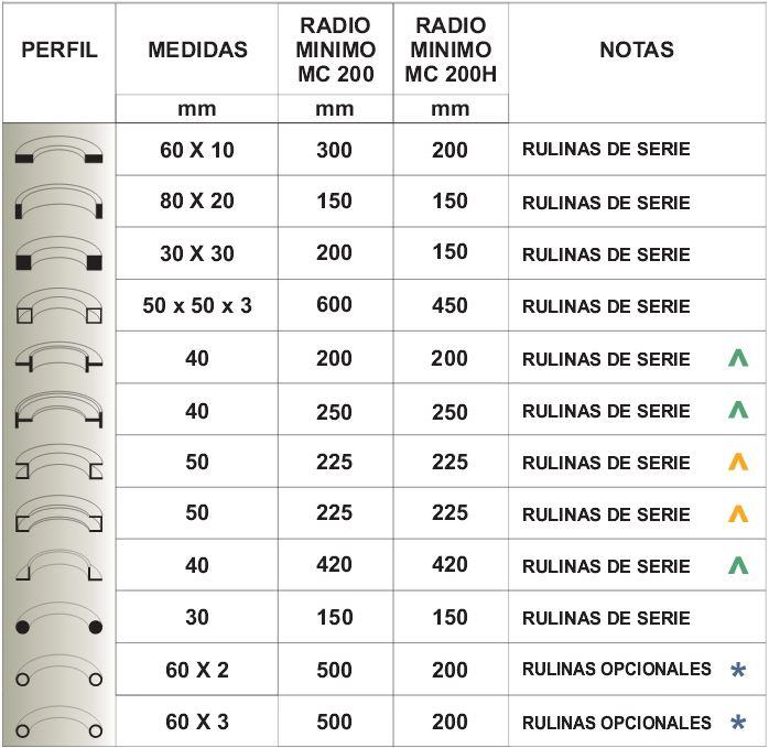 Isporučuje se sa modularnim valjcima za savijanje gotovo svih tipologija materijala osim okruglih cijevi, za koje se valjci isporučuju prema potrebnom promjeru kao dodatna oprema (nisu uključeni u iskazanu cijenu stroja).
